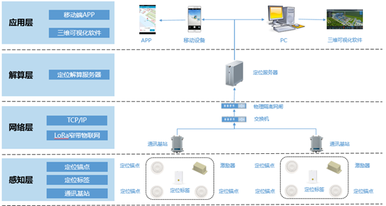 感知層:包括定位標簽、定位錨點、激勵器。定位標簽和定位錨點之間通過UWB信道實時測距,測距信息通過LoRa 2.4G無線網(wǎng)絡上傳到通訊基站。