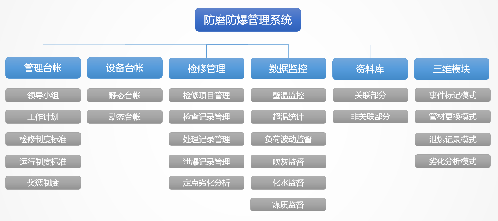 我國(guó)火力發(fā)電廠各種事故中,鍋爐事故約占發(fā)電廠總事故的70%以上,而過(guò)熱器、再熱器、省煤器、水冷壁四類(lèi)管(簡(jiǎn)稱(chēng)“四管”)泄漏與爆破事故時(shí)有發(fā)生,在眾多事故中出現(xiàn)較多,約占鍋爐總事故的70%以上,成為困擾火力發(fā)電廠安全生產(chǎn)的一大難題。針對(duì)這一問(wèn)題,云酷科技設(shè)計(jì)了防磨防爆可視化管理系統(tǒng)。